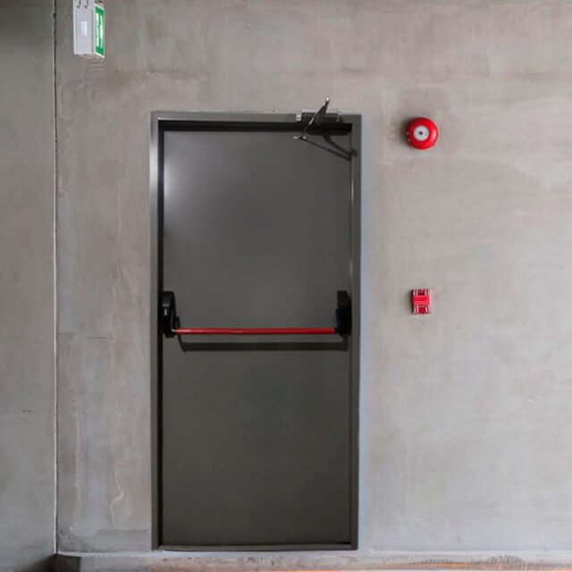 Barral antipánico interior tipo push con picaporte exterior y cerradura multipunto.